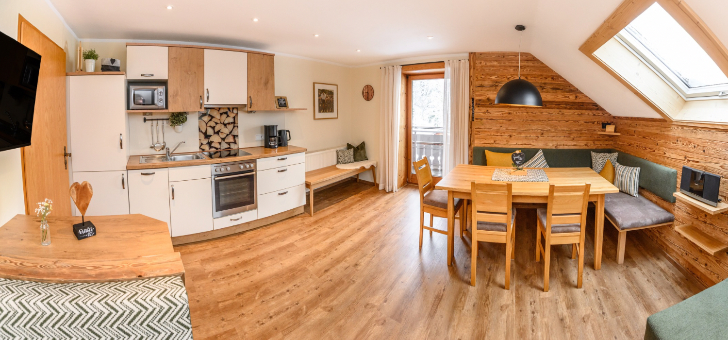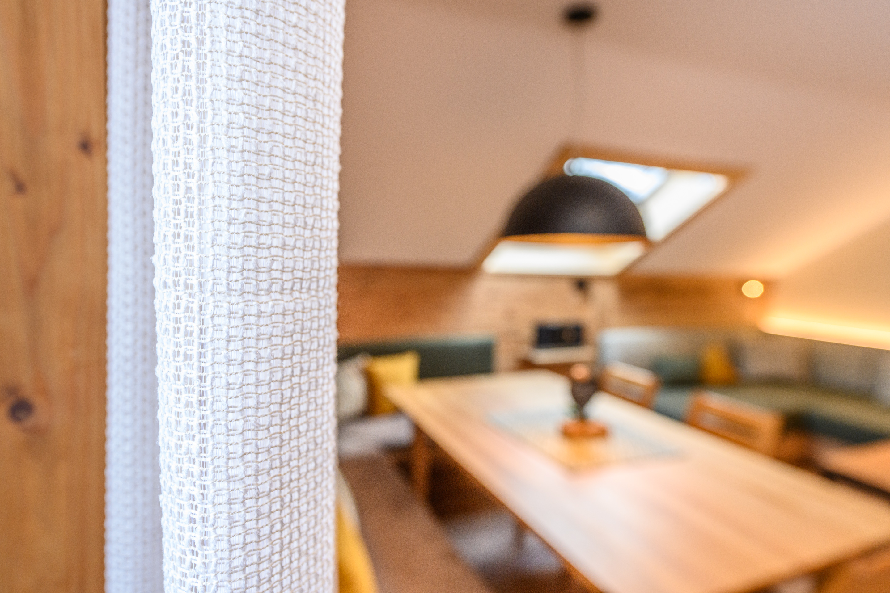 Der helle Wohn- und Essbereich überzeugt mit einer gelungenen Kombination aus modernem Komfort und alpinem Charme. Warme Holzelemente, gemütliche Sitzbänke und liebevoll abgestimmte Details schaffen eine einladende Atmosphäre. Die großzügige Sofaecke -vom Schreiner maßgefertigt- lädt nach einem ereignisreichen Tag in den Bergen zum Entspannen ein.