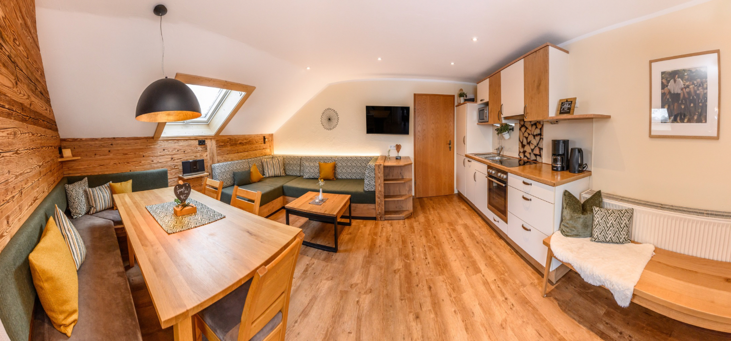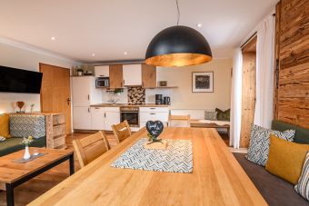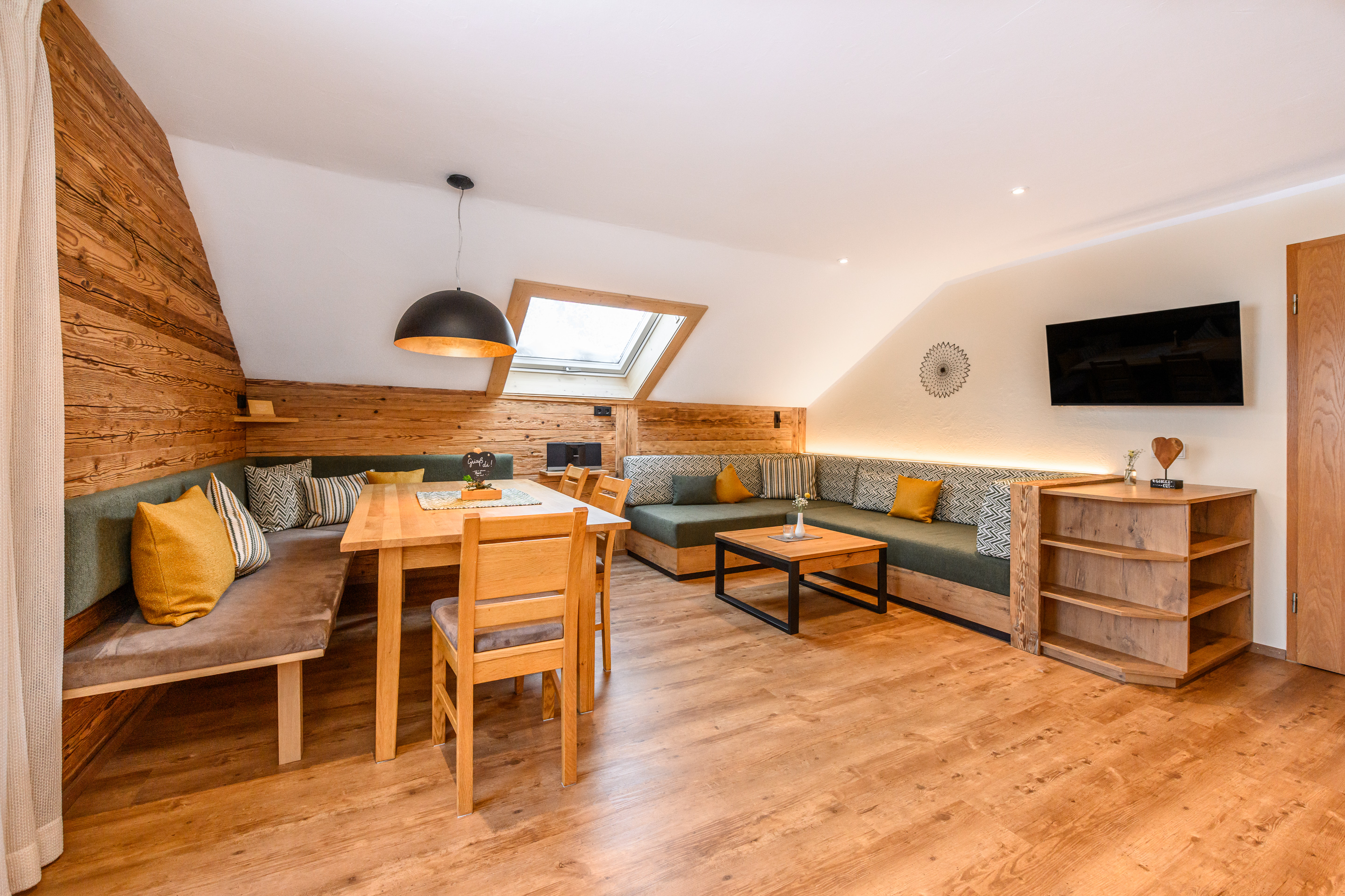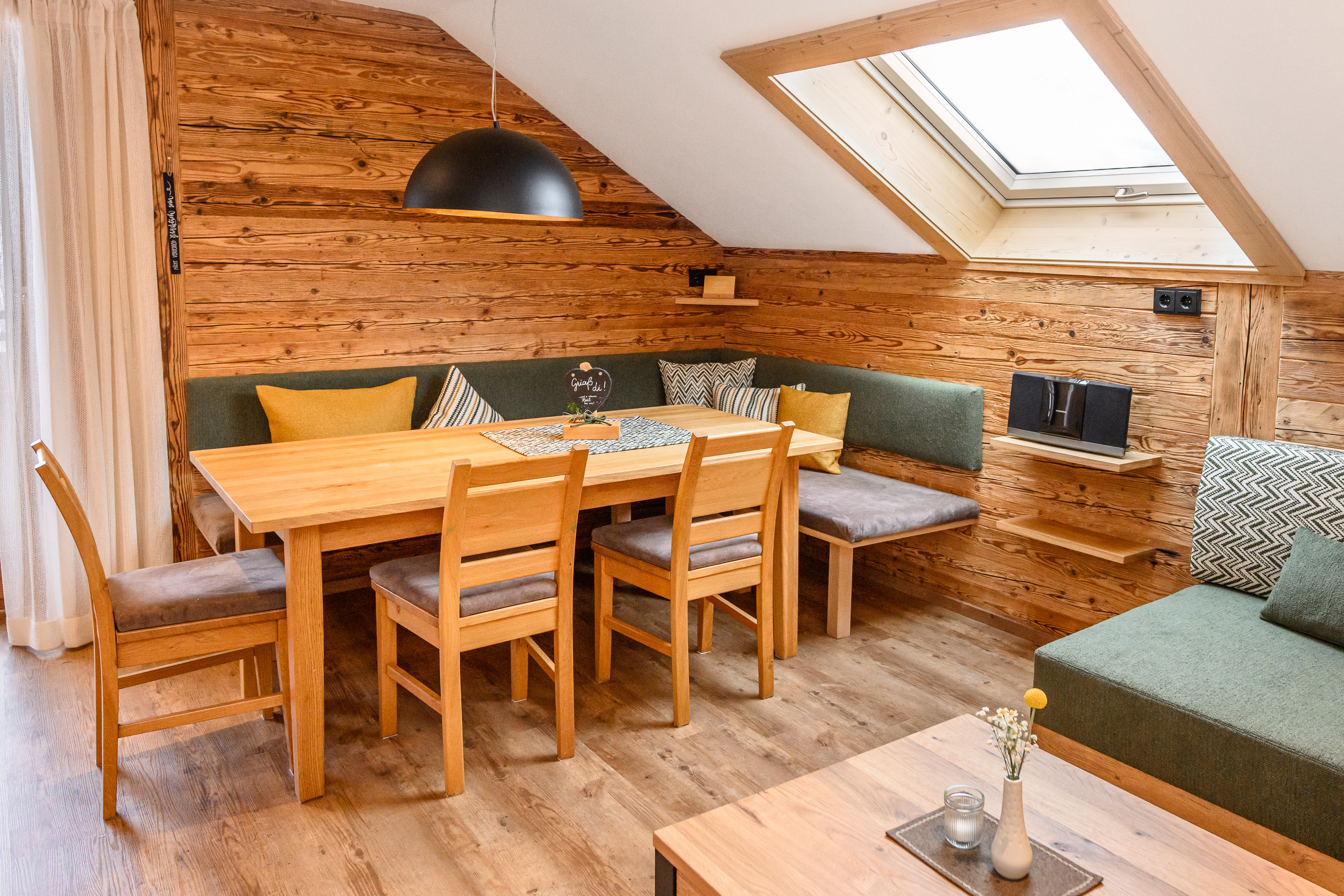 Der helle Wohn- und Essbereich überzeugt mit einer gelungenen Kombination aus modernem Komfort und alpinem Charme. Warme Holzelemente, gemütliche Sitzbänke und liebevoll abgestimmte Details schaffen eine einladende Atmosphäre. Die großzügige Sofaecke -vom Schreiner maßgefertigt- lädt nach einem ereignisreichen Tag in den Bergen zum Entspannen ein.